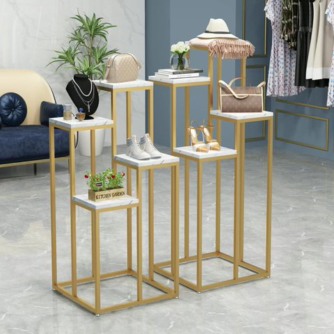 ร้านขายเสื้อผ้าตารางแสดงผลสี่เหลี่ยมตั้งกลางสูงและสั้นโลหะกระเป๋าถือรองเท้ายืนแสดง
