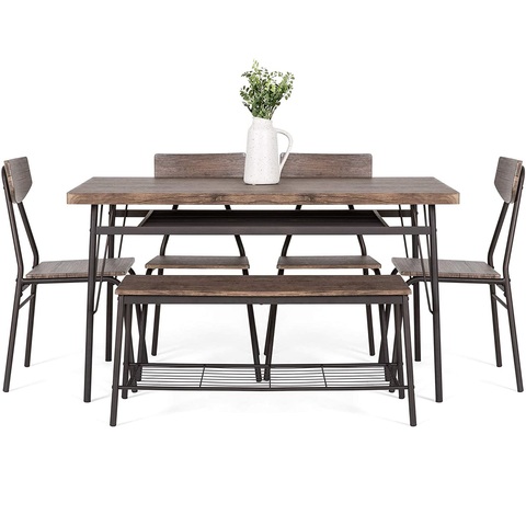 6 قطع 55 في المنزل الحديث الطعام مجموعة رفوف التخزين طاولة مستطيلة ، مقاعد البدلاء ، و 4 كراسي بني خشبي أثاث معدني